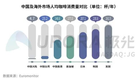 毕竟如果我们从全球市场来看,中国人对咖啡的接受度,其实仍属于一个小众市场。据 Euromonitor 统计,目前中国大陆地区咖啡人均饮用杯数仅为4.7杯/年,远低于美国、韩国、日本等咖啡市场已发展成熟的海外国家或地区的平均水平。