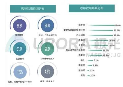 同时这也反映出了一个认知偏差,就是——咖啡是好东西,但咖啡本身是不好喝的。据极光调研数据显示,消费者饮用咖啡的最主要原因是为了提神醒脑,大部分人会选择在熬夜、办公时饮用咖啡。这意味着,就咖啡本身的产品属性而言,仍旧趋向于功能单一的提神饮品。