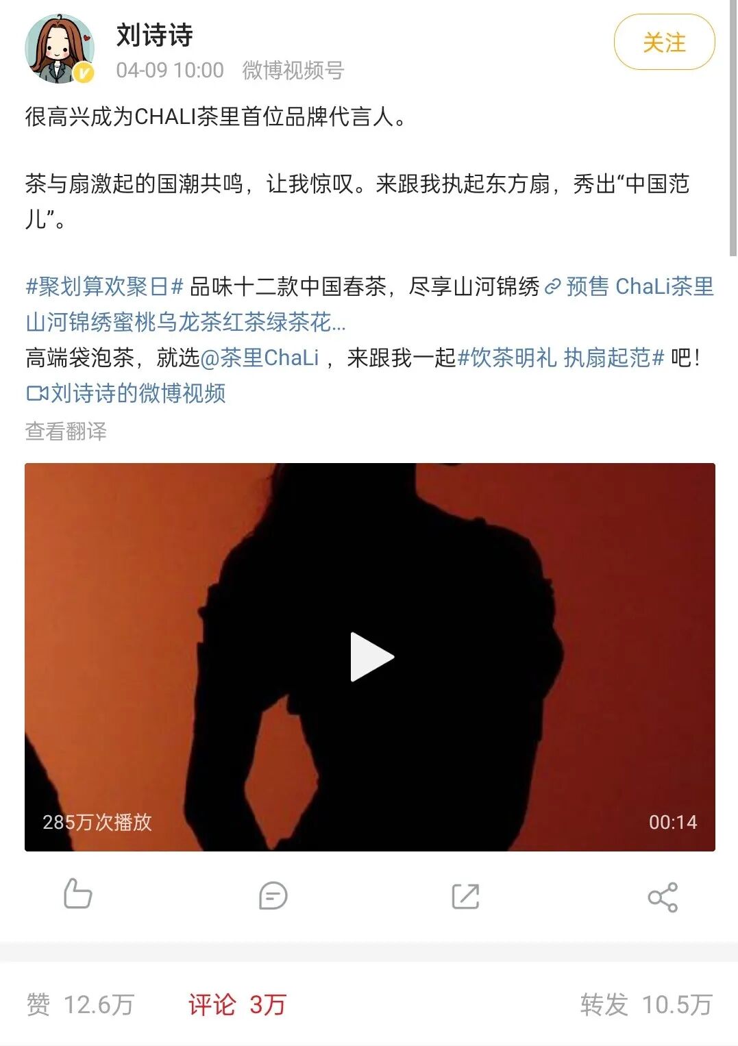 以刘诗诗官宣品牌代言人的微博为例,截至7月23日,单条微博转发已超过10w次,评论3w+条、点赞12.6w+,官宣视频播放量达285w次;另一品牌大使胡春杨的官宣微博收获3.6w转发、1.4w评论及9.7w点赞,官宣视频播放量达103w次;此外,平台上也不乏众多“黄v用户”的原创内容。