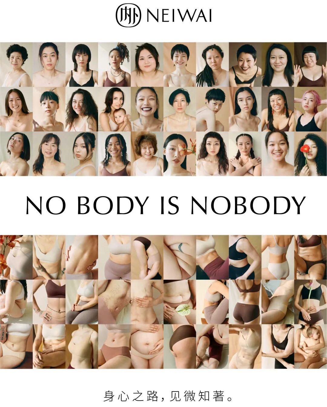 同样是 3 年之期,内衣品牌「NEIWAI 内外」开启了「NO BODY IS NOBODY」收官季,以“身心之路,见微知著”为主题,用镜头记录下女性真实的身体、勇敢的心灵,和真实多元的美。3 月 1 日至 3 月 30 日,同名摄影及纪录片作品也在上海安福路的线下空间同步展出。