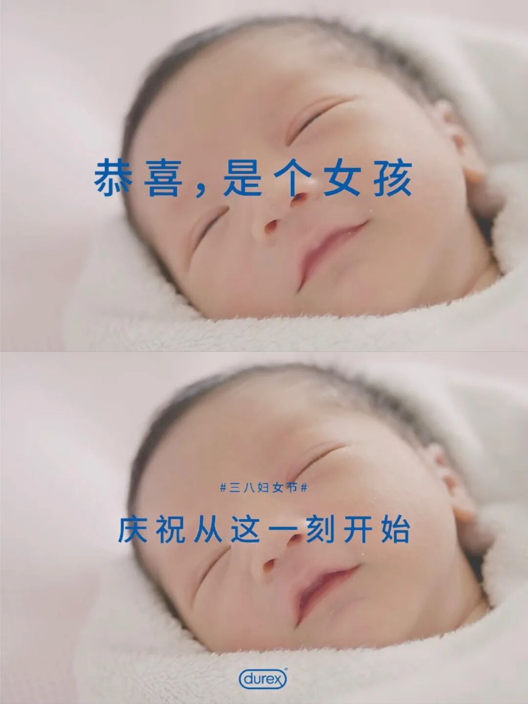 杜蕾斯选择从婴儿角度切入,从女孩出生的那一刻,通过多国语言形容对女孩出生的喜悦感,以反抗中国传统遗留的“重男轻女”的糟粕。