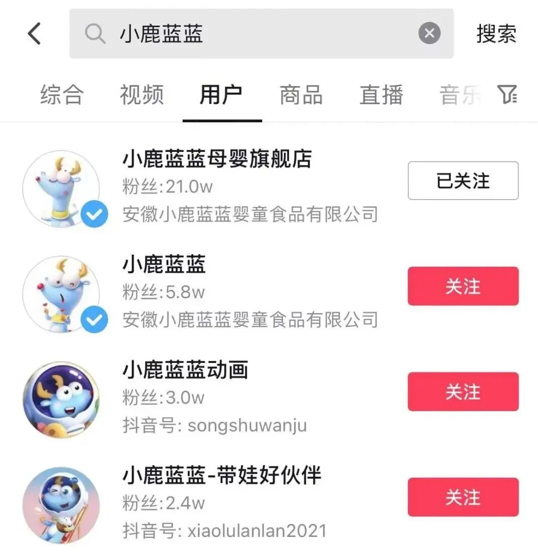 以三只松鼠孵化的新锐母婴食品品牌小鹿蓝蓝为例,目前产品 SKU 仅为 50 ,在这样的情况下,若矩阵号以产品线来划分,显得“多此一举”,品牌选择开设小鹿蓝蓝动画以及小鹿蓝蓝带娃好伙伴两个人设账号,以动画、带娃这样寓教于乐、生活化的方式贴近精致妈妈与宝宝人群。目前品牌的人设号仅有日常运营,还未开启常态化直播。