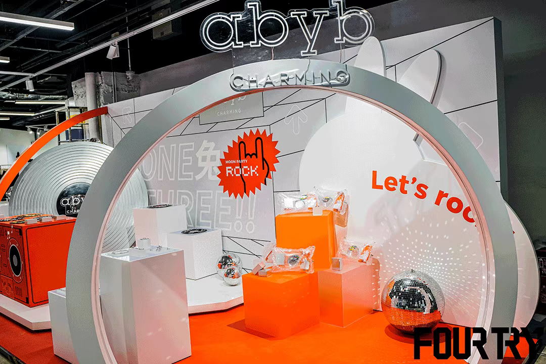 去年 9 月,abyb 在 TX 淮海开设“月球蹦迪”主题快闪店。为了传递品牌“日常化”的设计理念,品牌用最简单的白T来搭配产品。这些以品牌宣传为主要目的的活动,都是为了让品牌将抽象的理念转化成具体的场景,从而和消费者产生共鸣。据郭孟甜介绍,abyb 品牌线下门店计划也已经提上日程。