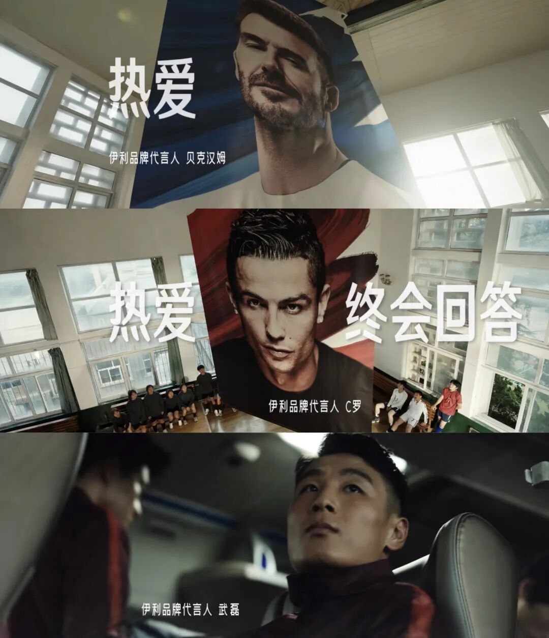 9 月 15 日,「伊利」官宣 C 罗、贝克汉姆、武磊为品牌代言人,用三位代言人的辉煌成就引出“热爱,以 7 为名”的口号,并发布一则热血短片,体现出品牌理念与足球运动热爱精神相契合,并预告伊利足球定制款产品即将上市。(官方微博)
