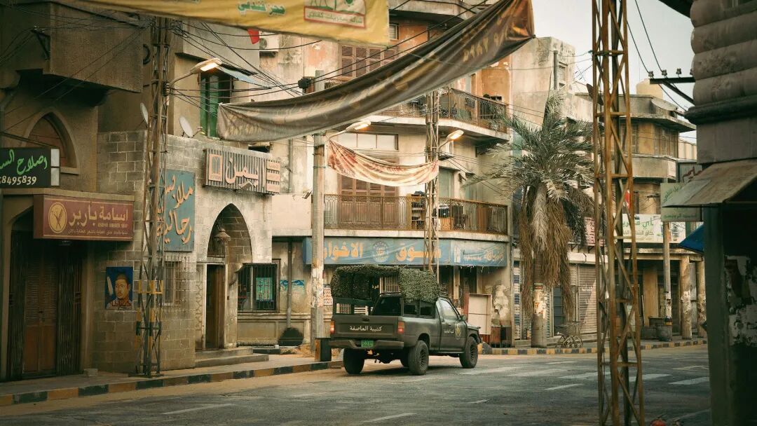 场景的完美复原在推进导演的现实主义叙事上具有不可忽略的重要性。极具地域特色的景观环境增强了影片叙事的现实感,陌生的异域风情也触发了观众的猎奇心理,叙事空间的塑造为后续故事的发展打下基础。影片中宗大伟和成朗登上驻外大使馆的天台,导演给了一个全景镜头,在镜头缓慢的调度下整个环境空间变得立体而真实,调动着观众的紧张情绪。