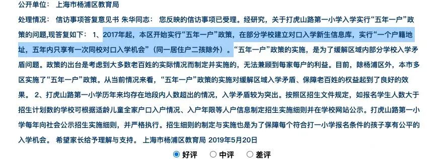 杨浦从2017年起,开始实行“五年一户”政策,在部分学校建立对口入学新生信息库,实行“一个户籍地址,五年内只享有一次同校对口入学机会”(同一居住户二孩除外)。