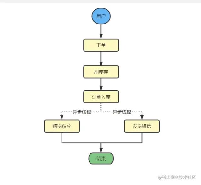 实际上,发送短信和赠送积分没有任何的依赖关系,通过异步,我们可以实现赠送积分和发送短信这两个操作能够同时进行,比如: