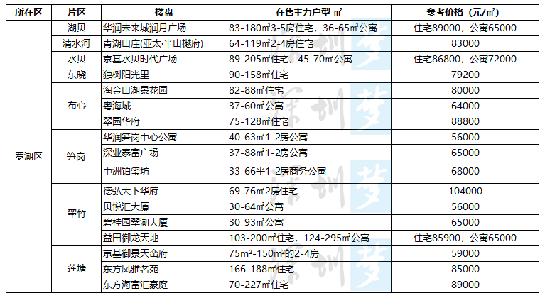 罗湖区目前主要在售楼盘包括:华润未来城润月广场、青湖山庄(亚太·半山樾府)、京基水贝时代广场、独树阳光里、淘金山湖景花园、粤海城、翠园华府、华润笋岗中心公寓、深业泰富广场、中洲铂玺坊、德弘天下华府、贝悦汇大厦、碧桂园翠湖大厦、益田御龙天地、京基御景天峦府、东方凤雅名苑、东方海富汇豪庭。