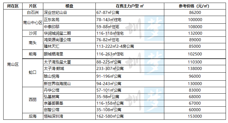 南山区目前主要在售楼盘包括:深业世纪山谷、正东名苑、中泰印邸、华润城润玺二期、鸿荣源尚璟公馆、臻林天汇、颐城栖湾里、太子湾泓玺大厦、太子湾·鲸域、晗山悦海、新世界临海揽山、丹华公馆、弘基朗寓、京基御景峯、创智公馆、恒裕深圳湾。