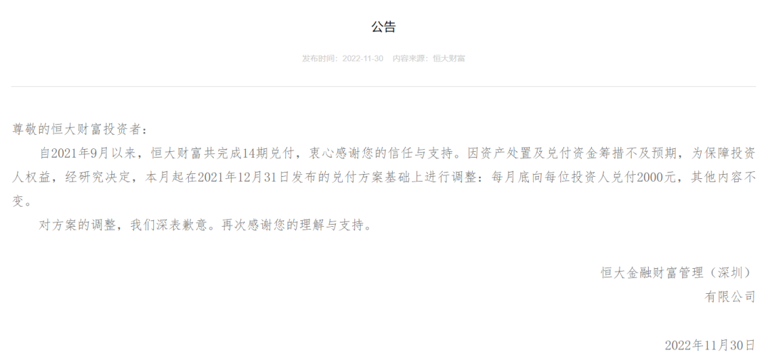 11月30日,恒大财富公告,自本月起对2021年12月31日发布的兑付方案进行调整,将现行每人每月兑付8000元调整为每人每月兑付2000元。此前,恒大财富曾于2021年9月13日、12月31日和2022年3月19日分别发布兑付相关公告。据接近恒大财富的知情人士透露,目前来看,调整兑付方案意味着恒大财富在资产处置方面正面临很大困难。自2021年9月以来,公司在相关部门的督促下协调筹集相关资源用于兑付,并在其官网陆续发布了与兑付相关的公告。本次公告的内容,或许是公司根据自身所投资项目的资金回笼实际情况不理想作出的调整。