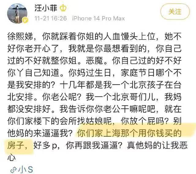 11月21日,一天时间内,汪小菲连发20余条小作文,手撕大S家人,提到的人数不下5位,微博内容被网友称为“发疯文学”。![]()