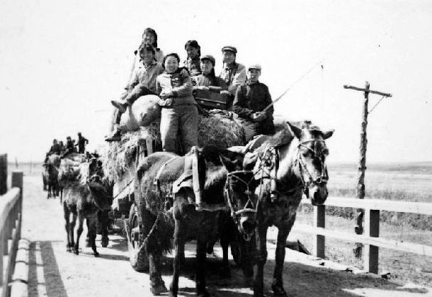 草原的六月天阳光明媚和风徐徐,马蹄的铁马掌敲击着坚硬的路面发出带有音乐感的踢踏声,知青们兴致很高歌声笑声被风吹去很远。这段路并不是很远,草原上的路弯弯曲曲也不平坦,那是一条车轮碾压自然形成的一条土路。车轱辘和马匹行走的地方低于没有碾压的地方,裸露出坚硬的黄土,没有被碾压的地方就长着青草,高出望去,绿一条黄一条像五线谱。中国的黑龙江省乃至岭北的农牧区生产队运输工具主要就是用这四匹马拉的大车。赶车的老板为了多装,都在原有的车板上用圆木绑扎加宽,俗称“跨杠”。