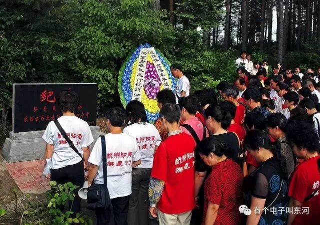 当年支边的岁月里,有七位杭州知青因事故疾病、自然灾害献出了年轻的生命,回访活动的日程之一就是为他(她)立碑。这是一块普通的不能再普通的纪念碑,五尺来宽,三尺来高,与近旁高大的苏军烈士纪念碑比起来,它简直是个侏儒。然而这绝不是一块普通的纪念碑,它经由抚远县政府特批,座落在县城西山头的风景区内依山傍水的松林间。在苏军烈士纪念碑落成后的六十多年时间里,它是在这块风水宝地内唯一建成的另一座纪念碑,足可见它在抚远人民心中的地位。这里的人民是把当年的苏联红军当作这块土地的解放者,而把杭州知青当作这块土地的建设者来祭奠的。它的碑文很简单“纪念—将青春和生命献给这块土地的杭州知识青年”,落款是“回望青春抚远行全体杭州知青”。