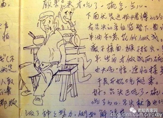 1970年我曾写过一篇名为《吕头正传》的手抄本“小说”,拿老驴头作为调侃对象。这是其中的插图之一,可以证实打赌吃面的故事基本属实。实际上,老驴头当时本是宣称吃不完五碗面应倒赔十碗的,对于我们灶来说,那可是一笔相当沉重的债务啊!后来也许是我们被迫耍赖,也许是回民灶的哥们儿没有较真儿,最终只赔了五碗。