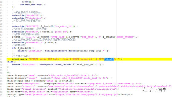 mysql_query("UPDATE goods SET hits = hits+1 WHERE goods_id = $_GET[ClickID]; ");翻到头部,可以发现这是一个提供访问的页面,也就是说下面的代码允许被外部访问执行。