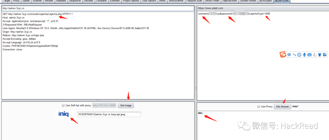 2.然后点击验证码获取验证码的地址,在proxy中找到获取图形验证码的请求,选中它并点击右键选择“Send to reCAPTCHA”,这个请求的信息将被发送到reCAPTCHA。