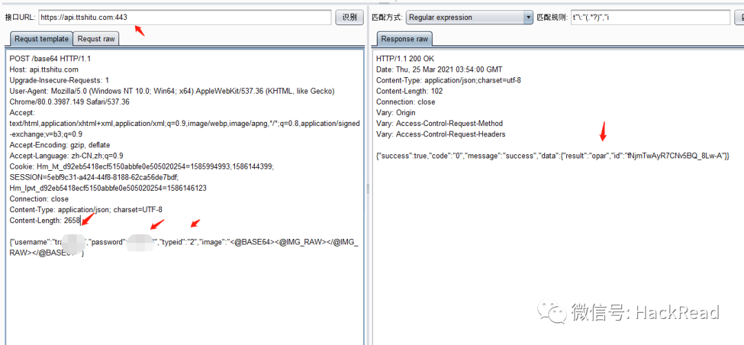 POST /base64 HTTP/1.1Host: api.ttshitu.comUpgrade-Insecure-Requests: 1User-Agent: Mozilla/5.0 (Windows NT 10.0; Win64; x64) AppleWebKit/537.36 (KHTML, like Gecko) Chrome/80.0.3987.149 Safari/537.36Accept: text/html,application/xhtml+xml,application/xml;q=0.9,image/webp,image/apng,*/*;q=0.8,application/signed-exchange;v=b3;q=0.9Accept-Encoding: gzip, deflateAccept-Language: zh-CN,zh;q=0.9Cookie: Hm_lvt_d92eb5418ecf5150abbfe0e505020254=1585994993,1586144399; SESSION=5ebf9c31-a424-44f8-8188-62ca56de7bdf; Hm_lpvt_d92eb5418ecf5150abbfe0e505020254=1586146123Connection: closeContent-Type: application/json; charset=UTF-8Content-Length: 2658{"username":"xxx","password":"xxxxx","typeid":"2","image":"<@BASE64><@IMG_RAW></@IMG_RAW></@BASE64>"}