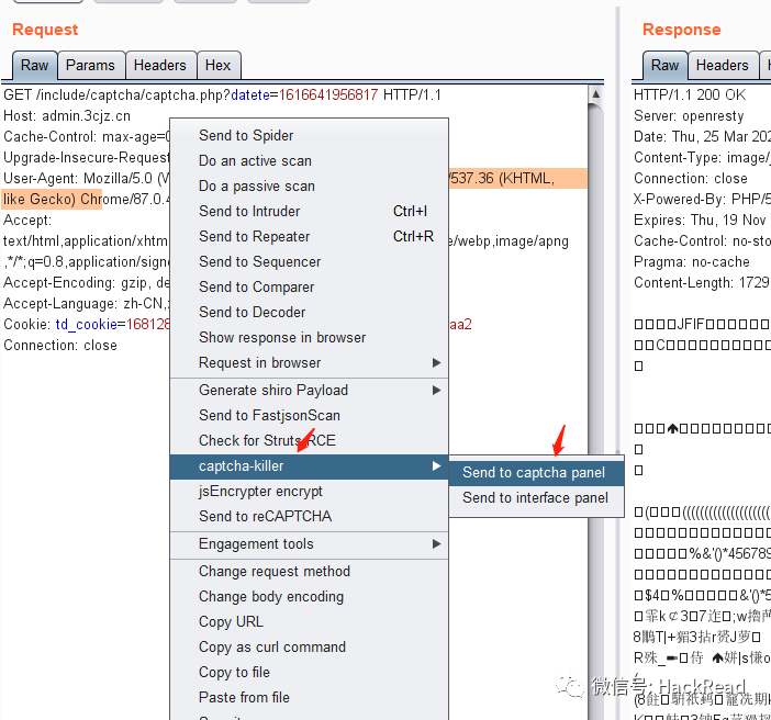 3.然后点击验证码获取验证码的地址,通过buspuit拦截验证码获取地址,然后proxy--proxy history中发送数据包到repeater中,选中它并点击右键选择“send to captcha panel”,这个请求的信息将被发送到captcha-kiler