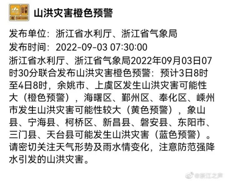 浙江省水利厅、浙江省气象局今天7点30分联合发布山洪灾害橙色预警:预计3日8时至4日8时,余姚市、上虞区发生山洪灾害可能性大(橙色预警),海曙区、鄞州区、奉化区、嵊州市发生山洪灾害可能性较大(黄色预警),象山县、宁海县、柯桥区、新昌县、磐安县、东阳市、三门县、天台县可能发生山洪灾害(蓝色预警)。请密切关注天气形势及雨水情变化,注意防范强降水引发的山洪灾害。
