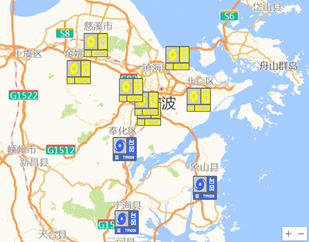 截至目前,海曙区、江北区、镇海区、北仑区、鄞州区、余姚市、慈溪市发布台风黄色预警信号;奉化区、宁海县、象山县发布台风蓝色预警信号。