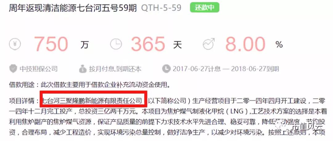 七台河系客户的质押主体是七台河三聚隆鹏新能源有限责任公司,连名字都起了三聚,说明是和三聚合作的公司,这家公司股权质押给北京润丰财富股权投资,融资了1.5亿,动产抵押给了凯旺融资租赁有限公司,融资合计2.75亿。