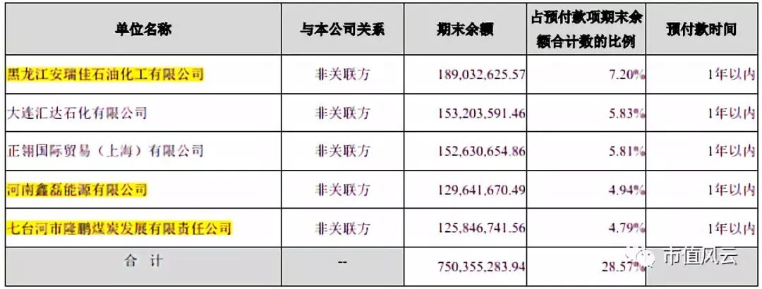 2016年的预付款前五名中,黑龙江安瑞佳和七河台隆鹏煤炭发展有限责任公司是客户,河南鑫磊能源有限公司是17年53亿订单最大客户鹤壁世通绿能石化科技发展股份有限公司股东的股东。