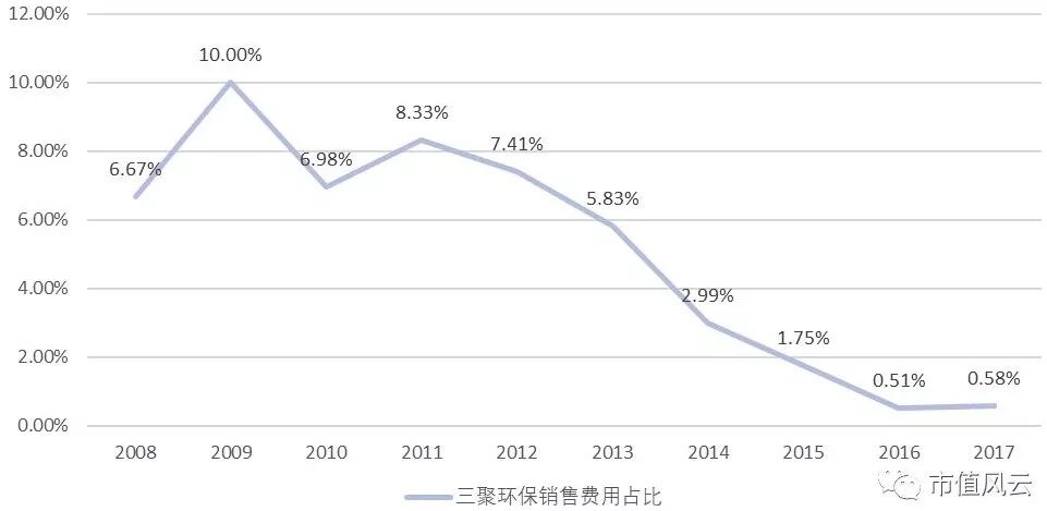 然而离奇的是,三聚环保销售费用占营业收入比例越来越小,2017年销售费用率仅有0.58%,营业利润高达28.3亿,但是经营现金流净额为-3.5亿: