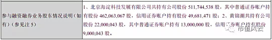 2017年年报显示,北京海淀科技发展有限公司(以下简称“北京海淀”,第一大股东)共持有5.117亿股,质押4.60亿股,质押比例高达89.80%,副董事长兼总经理林科及其配偶张雪凌共持有1.757亿股,质押1.39亿股,质押比例79.12%。