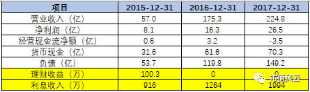 2015年理财收益只有100万、2016年和2017年的理财收益完全为零,利息收入分别为916万、1264万、1994万,而这三年中,四个季度末的平均货币资金余额分别是20.84亿、41.54亿、53.11亿。