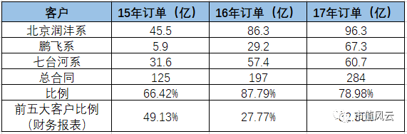 如果把润沣系、鹏飞系和七台河系的公司合同做个统计,就会发现前三大客户占比很大,2016年甚至达到87.79%。三聚环保只是将这些客户的关联公司分为不同的主体,因此财务报表上看起来不明显: