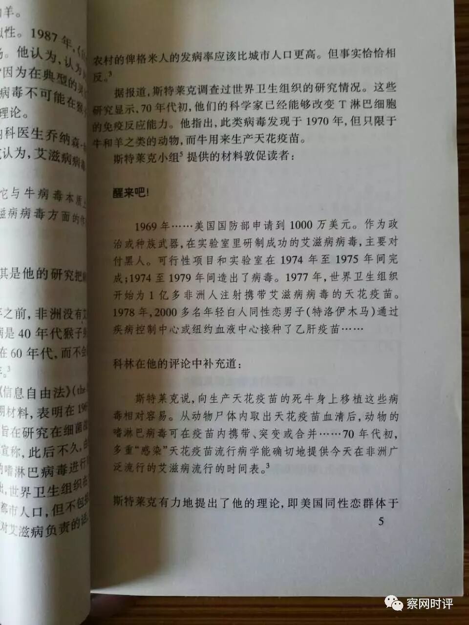 【“1969年……美国国防部申请到1000万美元。作为政治或者种族武器,在实验室里研制成功的艾滋病病毒,主要对付黑人。可行性项目和实验室在1974年至1975年间完成;1974至1975年间造出了病毒。1977年,世界卫生组织开始为1亿多非洲人注射携带艾滋病病毒的天花疫苗。”】