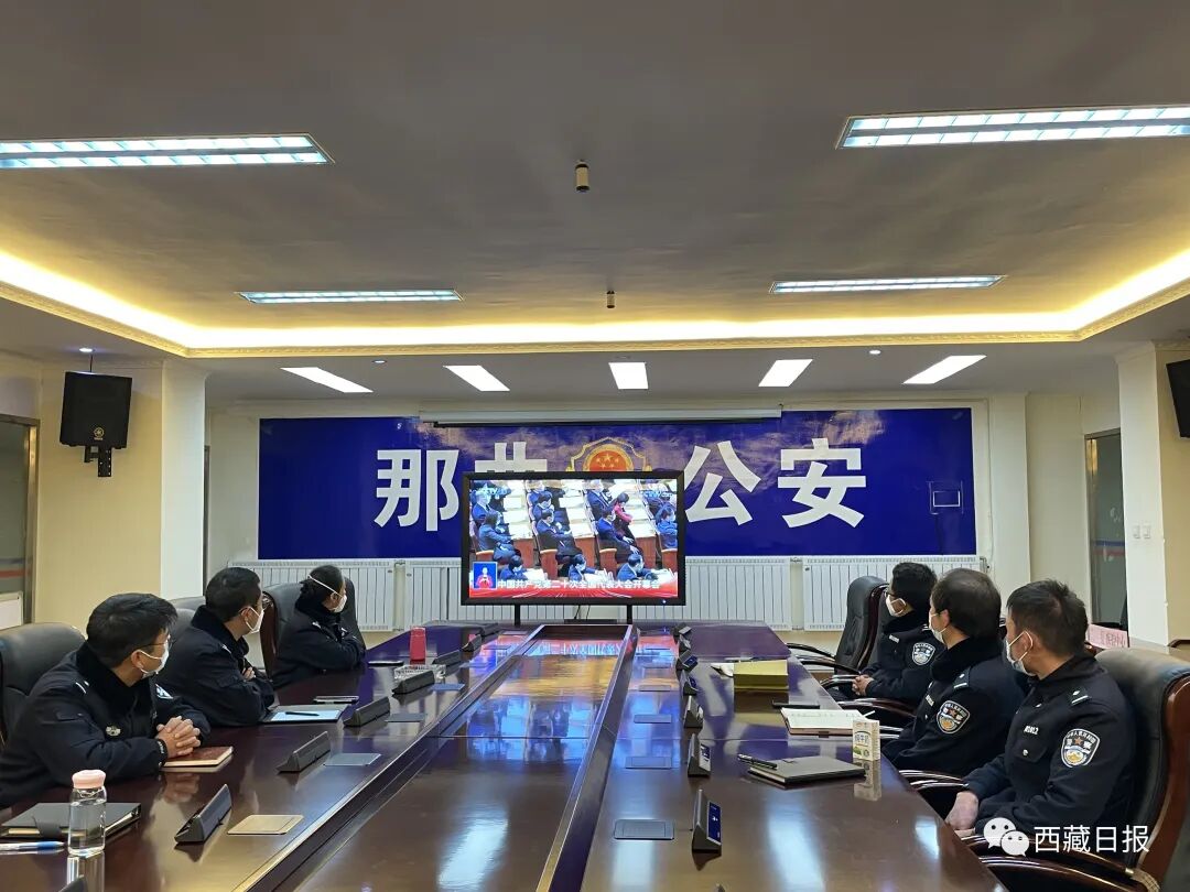 那曲市公安局办公室民警集中收看开幕会盛况。