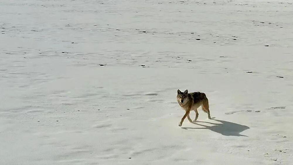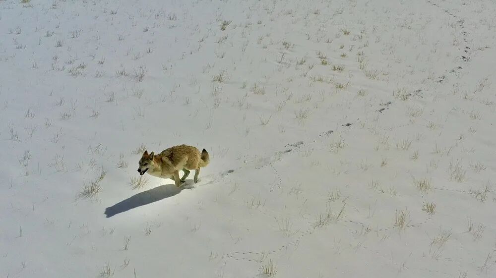 天地一色,狼群在雪地里不断地向前奔跑。