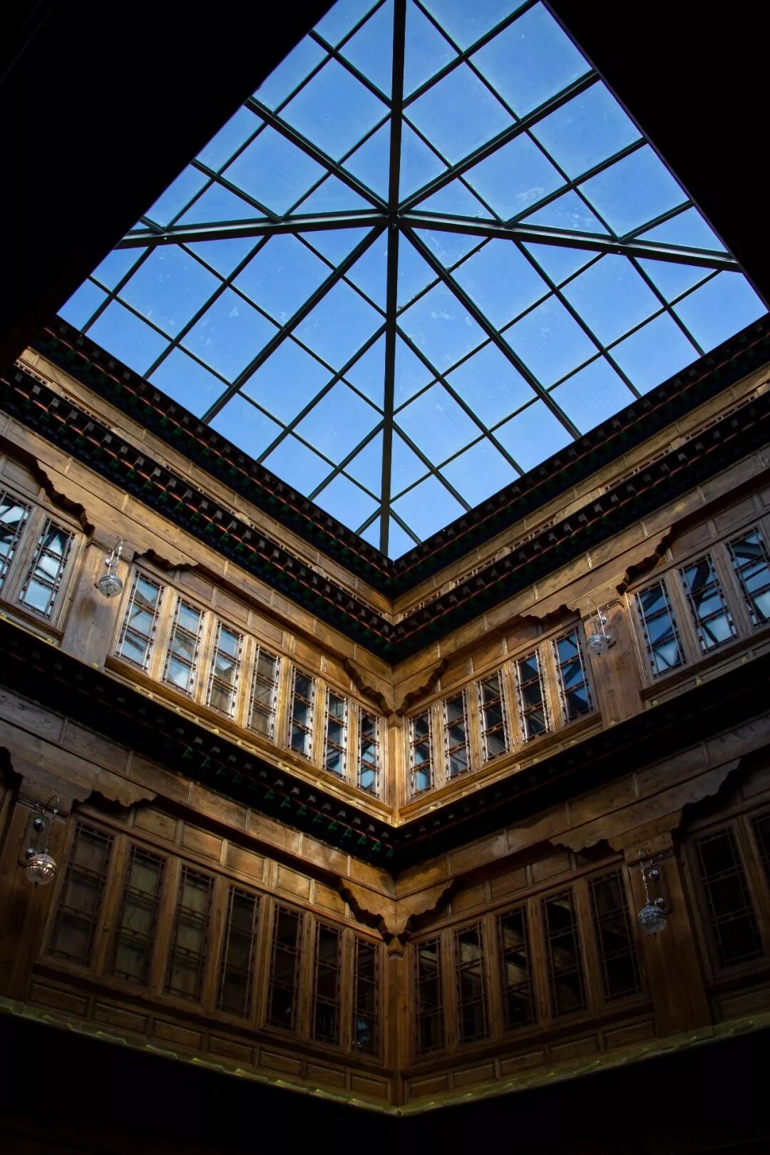 ▲ 在松赞曲吉林卡酒店的大堂抬头仰望,是隔着玻璃都一蓝到底的天空。
