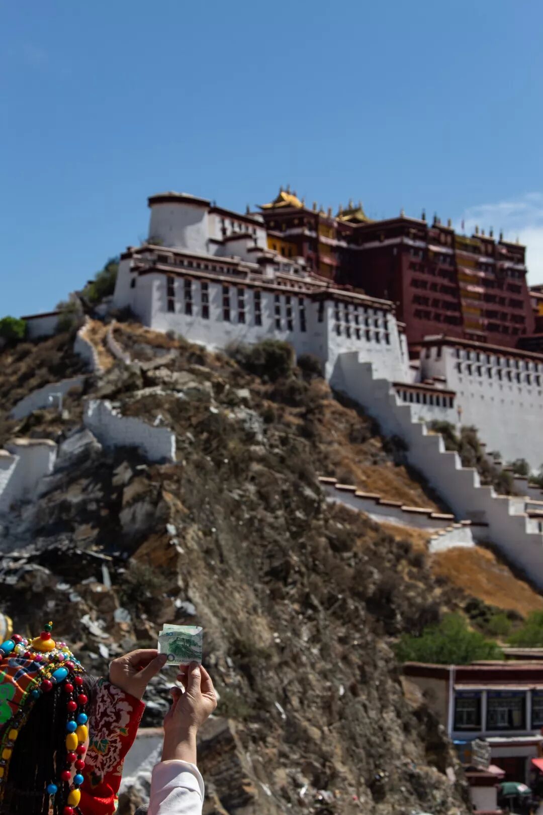 ▲ 50元人民币图案取景地——布达拉宫。从这个三层小楼高的观景台上看布达拉宫,举着钱对着圣地拍照,就像大妈面对镜头比剪刀手一样自然。一摸兜,没带钱?没关系,这里应该是全国50元纸币最集中出现的地方了,总会有人带的。