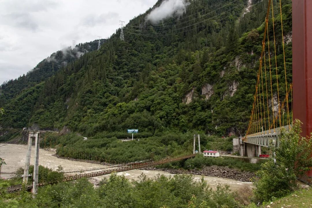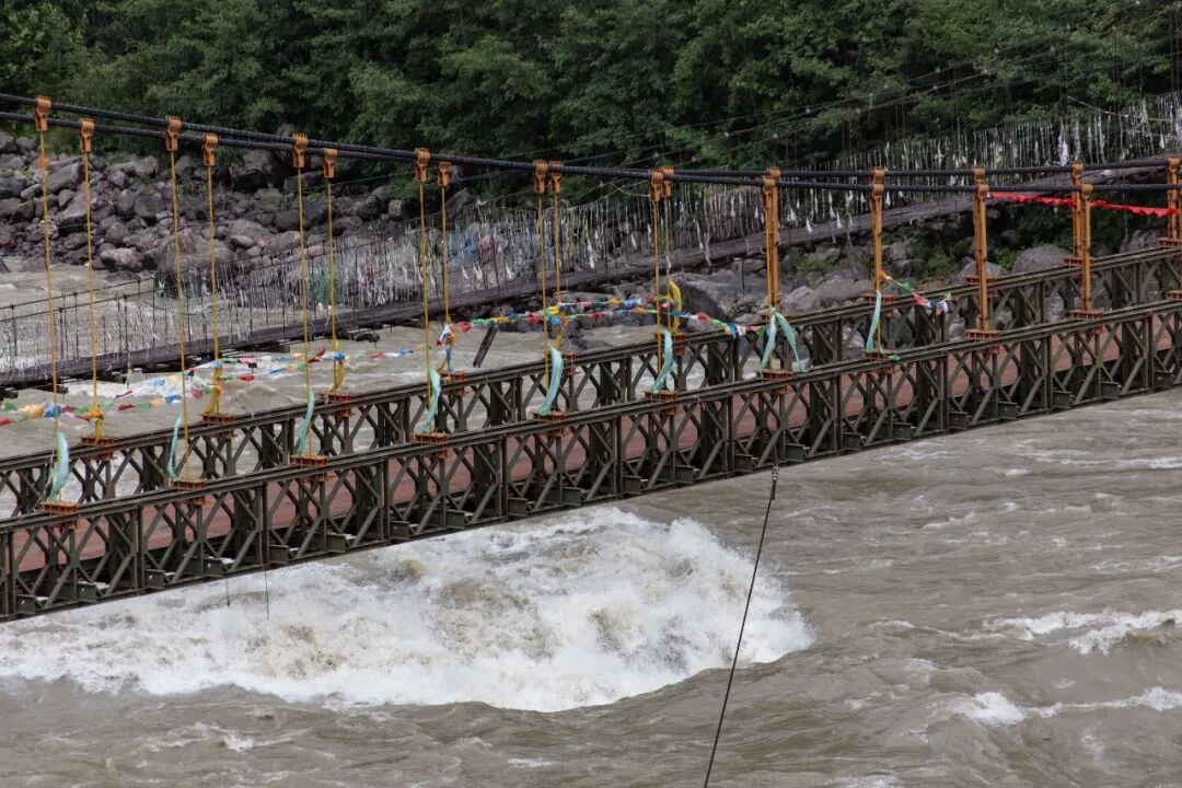 ▲ 通麦悬索吊桥、汽车保通便桥和新建的256米单跨单塔悬索桥,三桥并列,见证了这里从凶险到畅通的变化岁月。