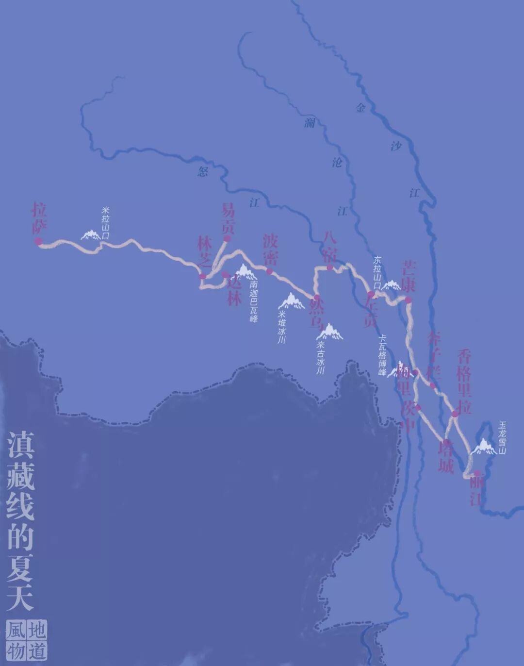 ▲ 本次旅行的完整线路。我们的这条线从拉萨出发,到图中芒康的位置向右转,南下一路至香格里拉结束(实际最远可抵达丽江)。绘/Paprika