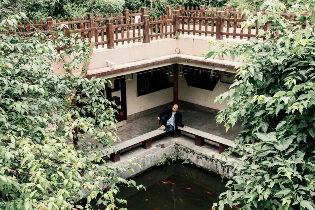 在古香古色的园艺园内,盆摘、假山、石碑、花台、草坡随处可见,曲径花墙,穿洞越门,空窗的设计移情于景,犹如一幅中式扇画。经山石蹬道上二层,几位老人面朝荷塘,拉奏《草原之夜》,颇有古人游园的风趣。