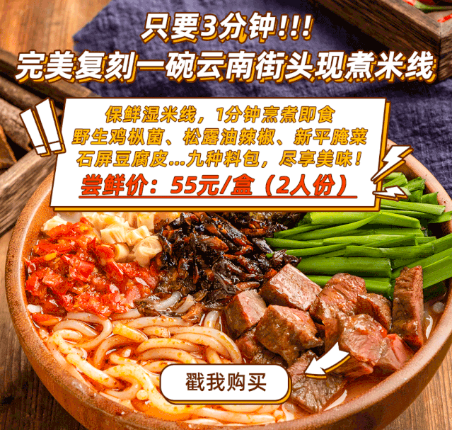 看完了云南米线,有没有流口水!风物君给大家找到了一款可以带走的“云南米线”,采用保鲜湿米线,一分钟烹煮即食,还有野生鸡枞菌、松露油辣椒、新平腌菜、石屏豆腐皮等九种料包,只要三分钟,就能在家完美复刻云南街头现煮米线。
