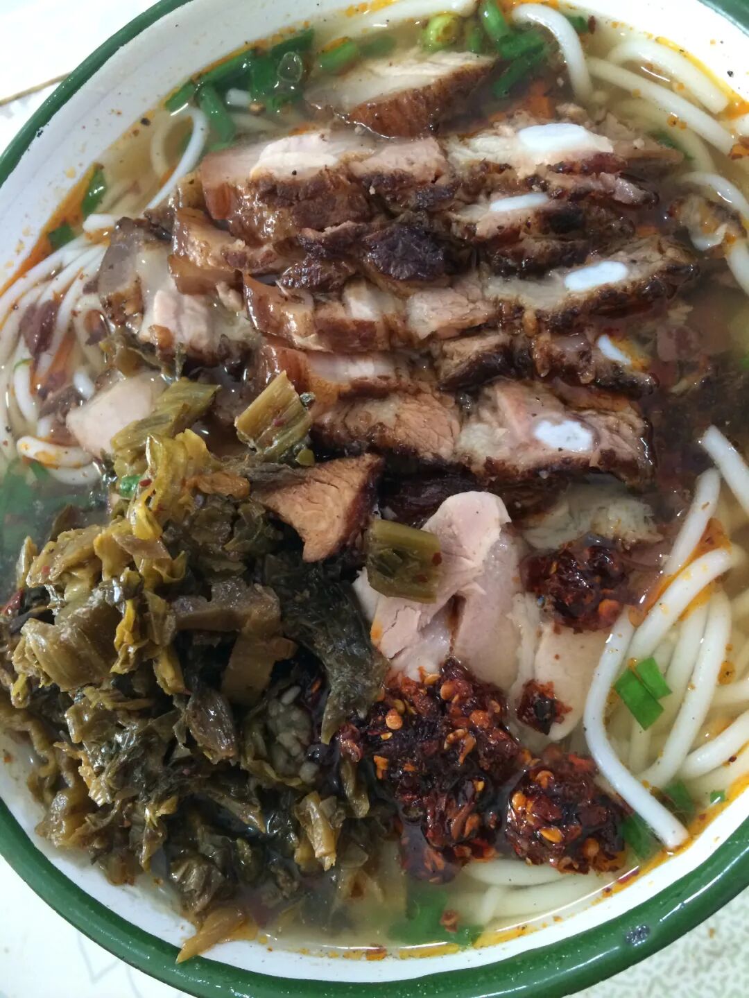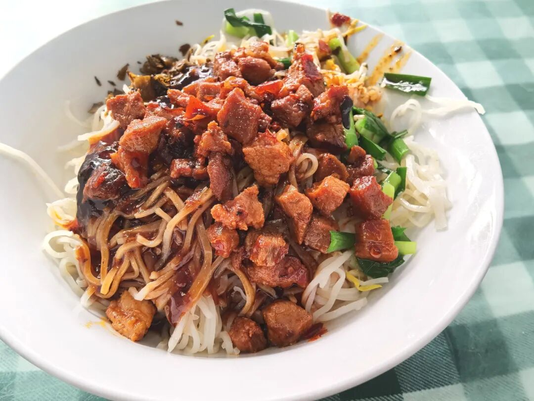 云南米线的肉帽子可太多了,杂酱、焖肉、肥肠、叶子(猪皮)、香酥(酥肉)、牛肉之类的,家家户户各有钻研。再叼几筷子腌菜、韭菜、豆芽……一年四季都能吃个不重样。