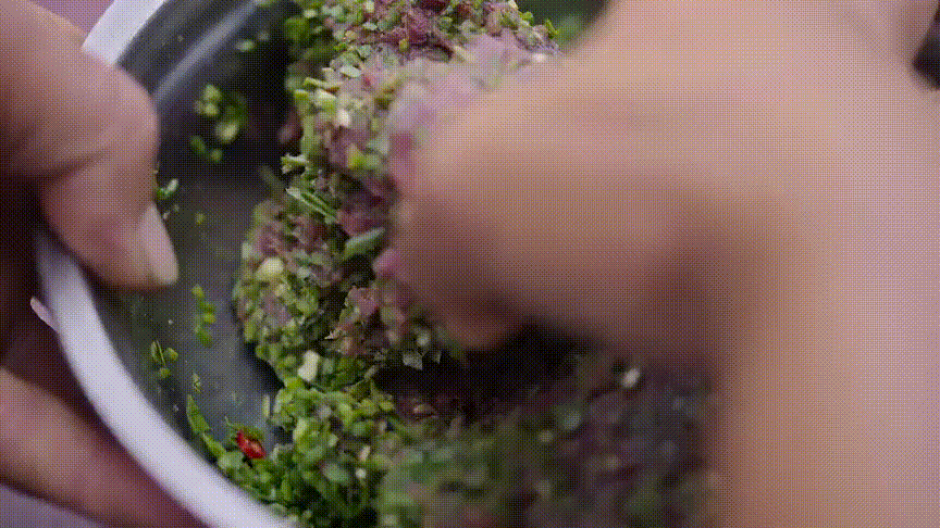 将精瘦的生肉捣烂成泥状,佐以韭菜、小米辣、缅芫荽(香菜)以及各种香料,最后浇上的点睛之笔——“苦肠水”,由牛肠子中未完全消化的草料熬制而成,这可是征服了米线、蔬菜、冒肉等各界佳肴的灵魂蘸食。