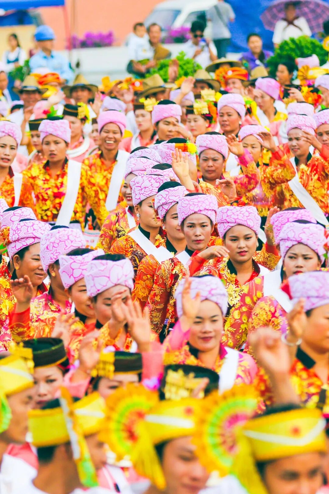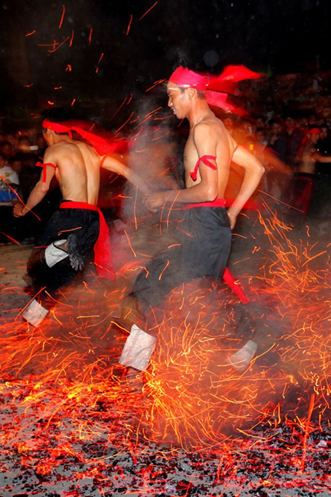 ▲ 图一 景颇族的姑娘。图二 傈僳族下火海。图三 傣族万人噶秧。摄影/朱边勇