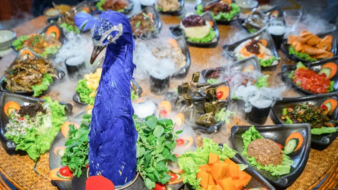 与傣族人不同的是,在景颇族的眼里,万物皆可入菜。绿叶宴上,各式蔬菜以烤、煮、炸、腌、拌等方式频频出现。当地人常挂在嘴边的舂菜便是指将全部食材放入石臼里,经千锤百炼后,让彼此在破壳时“坦诚相待”。