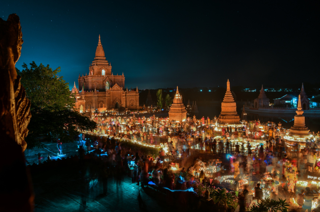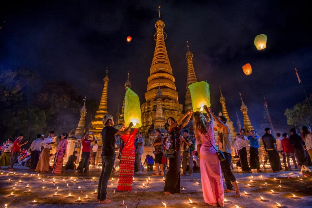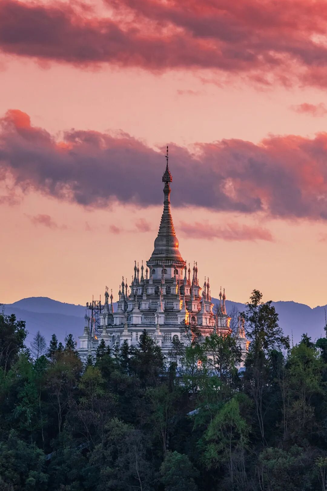 等到黄昏满霞时,坐落于雷牙让山顶的金银塔,一改半掩面庞的羞红腼腆,只留下星光霞彩披身的绰约风姿,它们点缀着芒市的碧水蓝天,也照亮穿梭如织的夜行人。