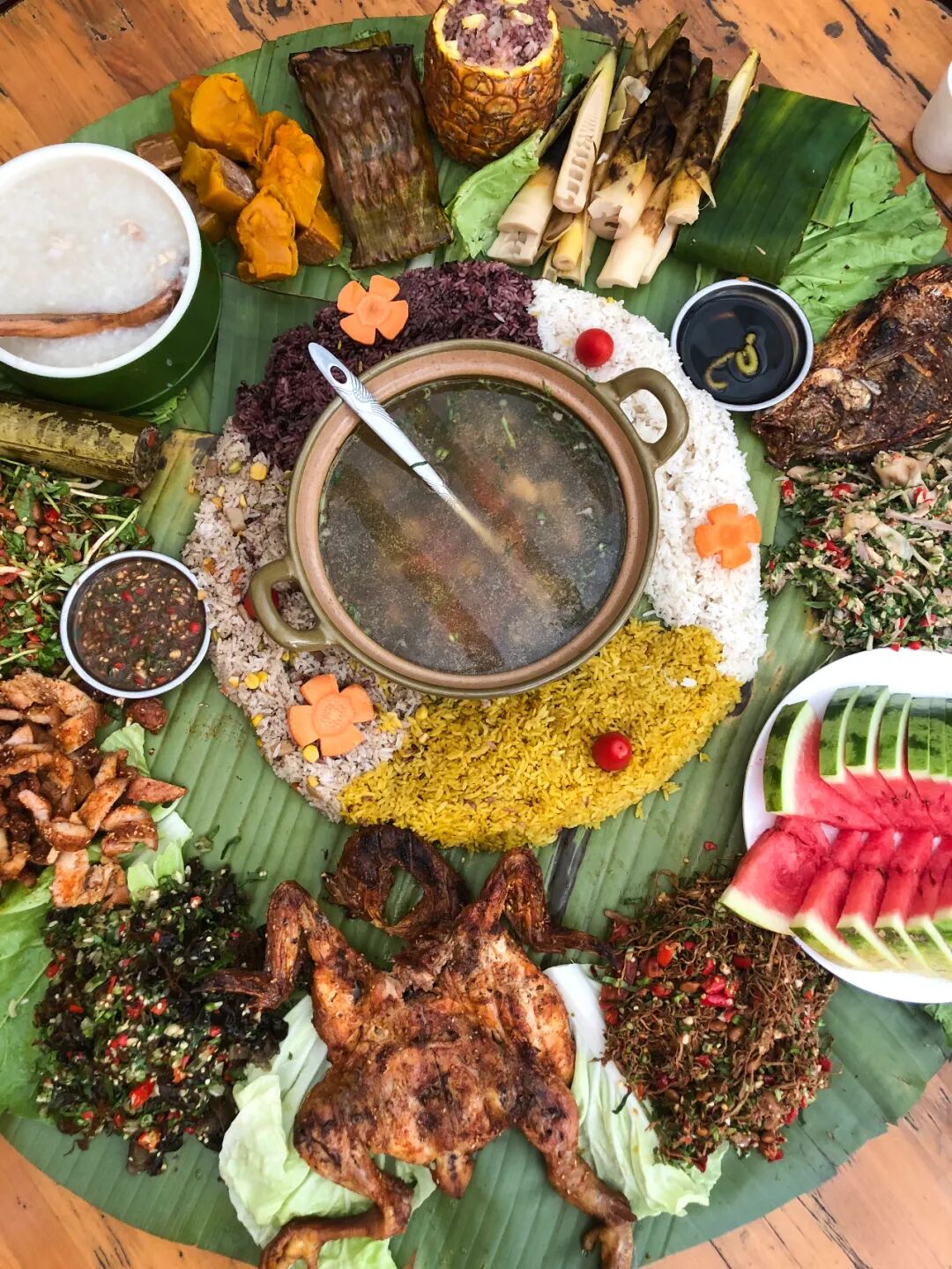 又宽又圆的簸箕里,摆满了花米饭、烤鱼、烤五花肉等,大家挑上爱吃的,用手包成一团,不拘小节,颇有几分自在洒脱。