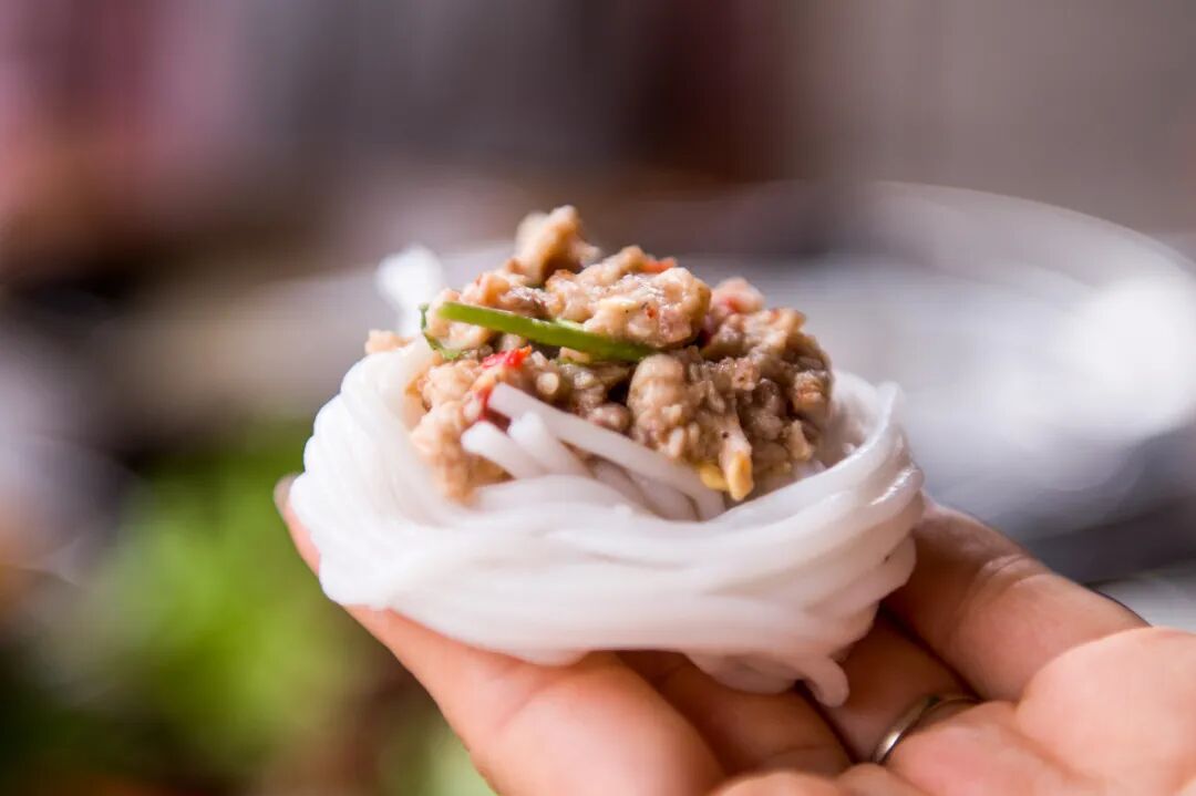 等来到阿昌族的家乡,有时似乎连食物的器具也免了。广为熟知的过桥米线,在陇川户撒,摇身一变成了过手米线。当地人将一团米线置于手心,再给白莹莹的“线团”盖上一顶斑斓的“帽子”,一口一个,吃得酣畅淋漓。