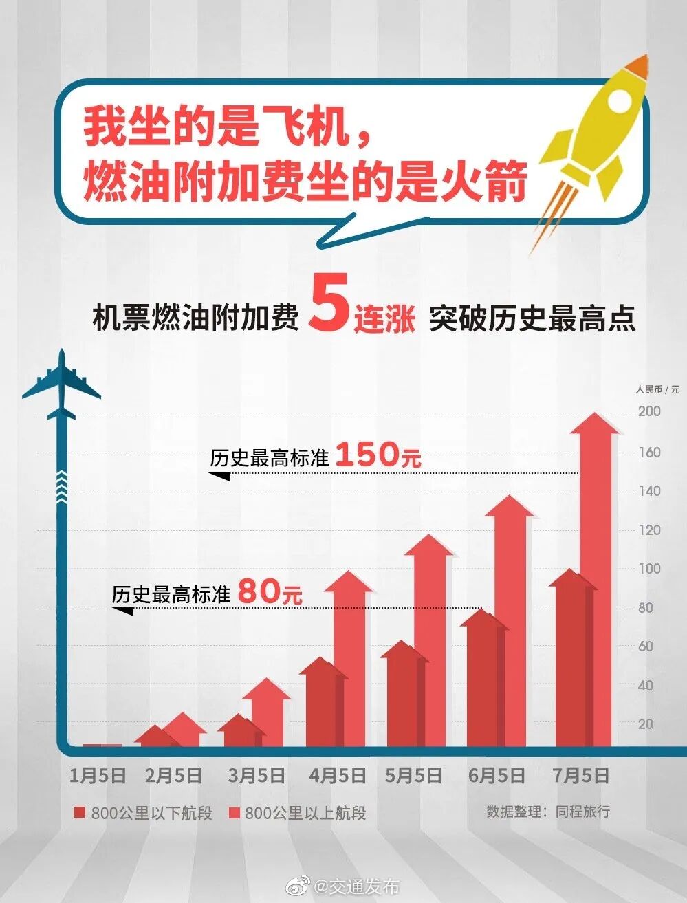 多家航司将于7月5日零时起上调燃油附加费收取标准。这已是2月燃油附加费恢复征收以来第5次涨价,创下历史新高。新的国内航线燃油收取标准为:800公里(含)以下航段,每位旅客收取人民币100元;