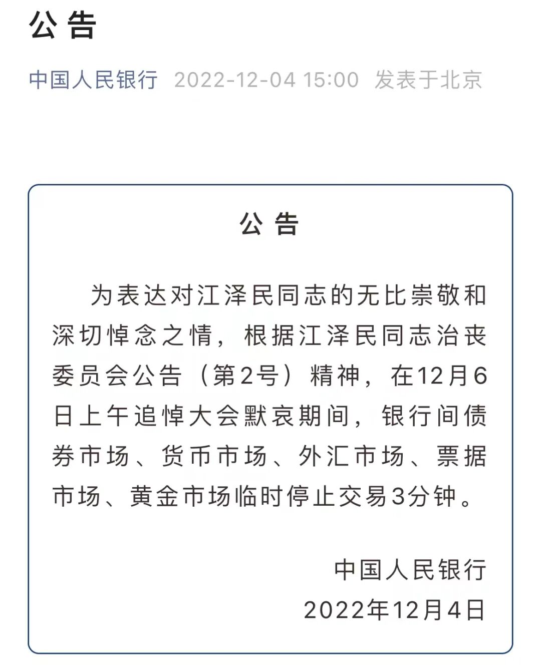 12月4日,上交所发布、深交所、北交所发布微信公众号分别发布《关于江泽民同志追悼大会默哀期间临时停市的通知》,其中提出:为表达对江泽民同志的无比崇敬和深切悼念之情,根据中国证监会公告,本所定于2022年12月6日上午江泽民同志追悼大会默哀期间,临时停市3分钟,默哀结束后恢复交易。