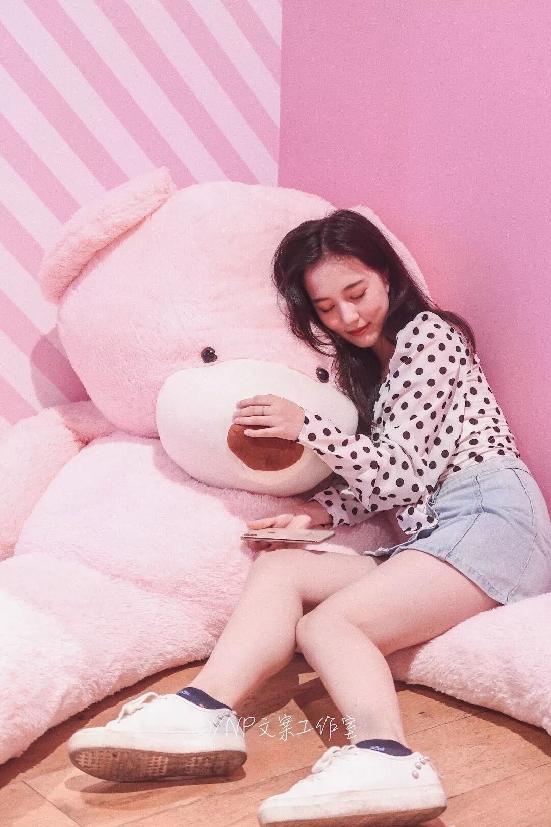 趴在粉色大熊身上能让自己看起来小巧一些,拿着cupcake照一张照片,假装自己正在享用下午茶。